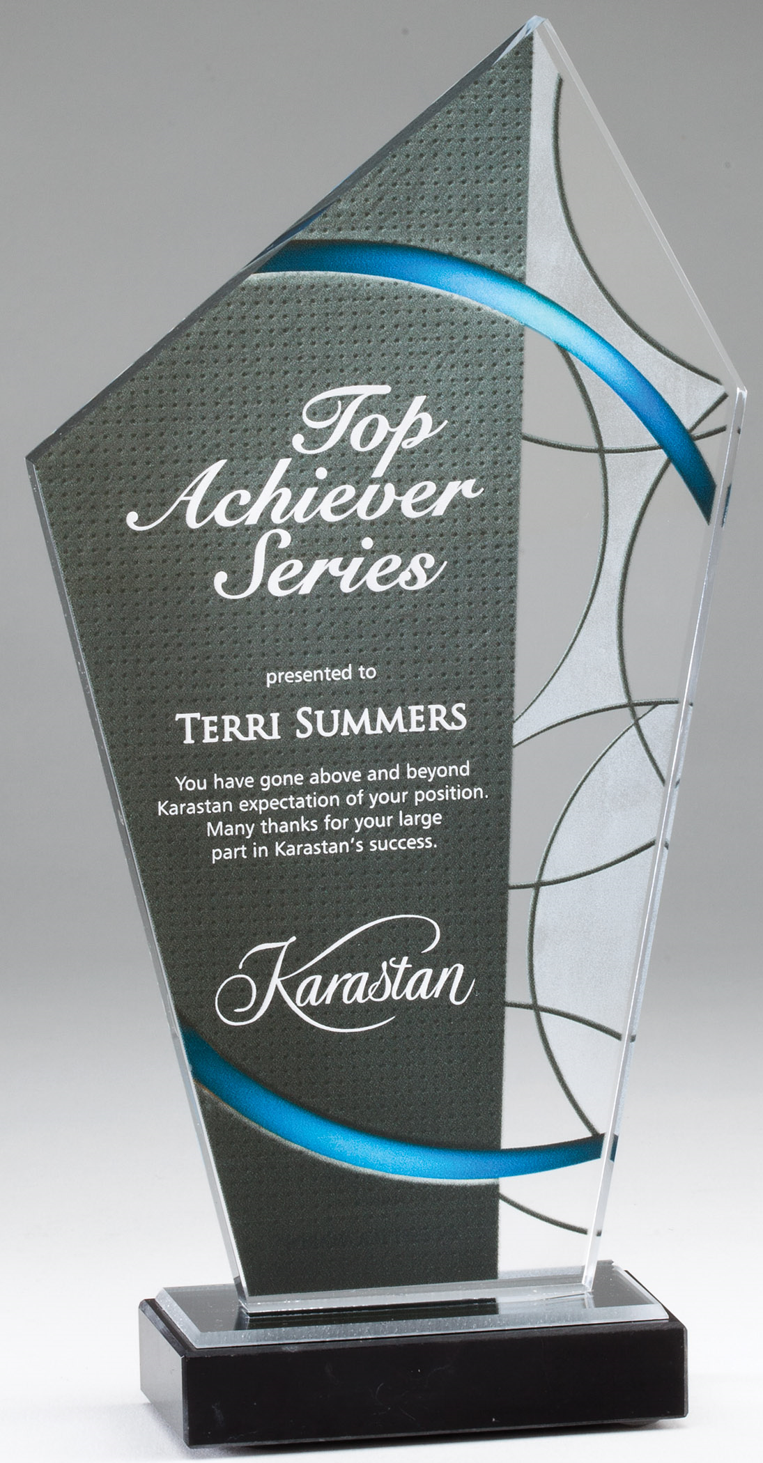 ACR418 ELEGANT STAINED GLASS CLEAR/BLUE ACRYLIC AWARD ON BLACK MARBLE BASE LASERABLE 5 1/2″ X 11″